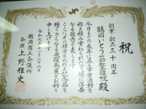 鶴岡に来て30年が経って、先週、鶴岡商工会議所から創業30周年という事でお祝いして頂きました。